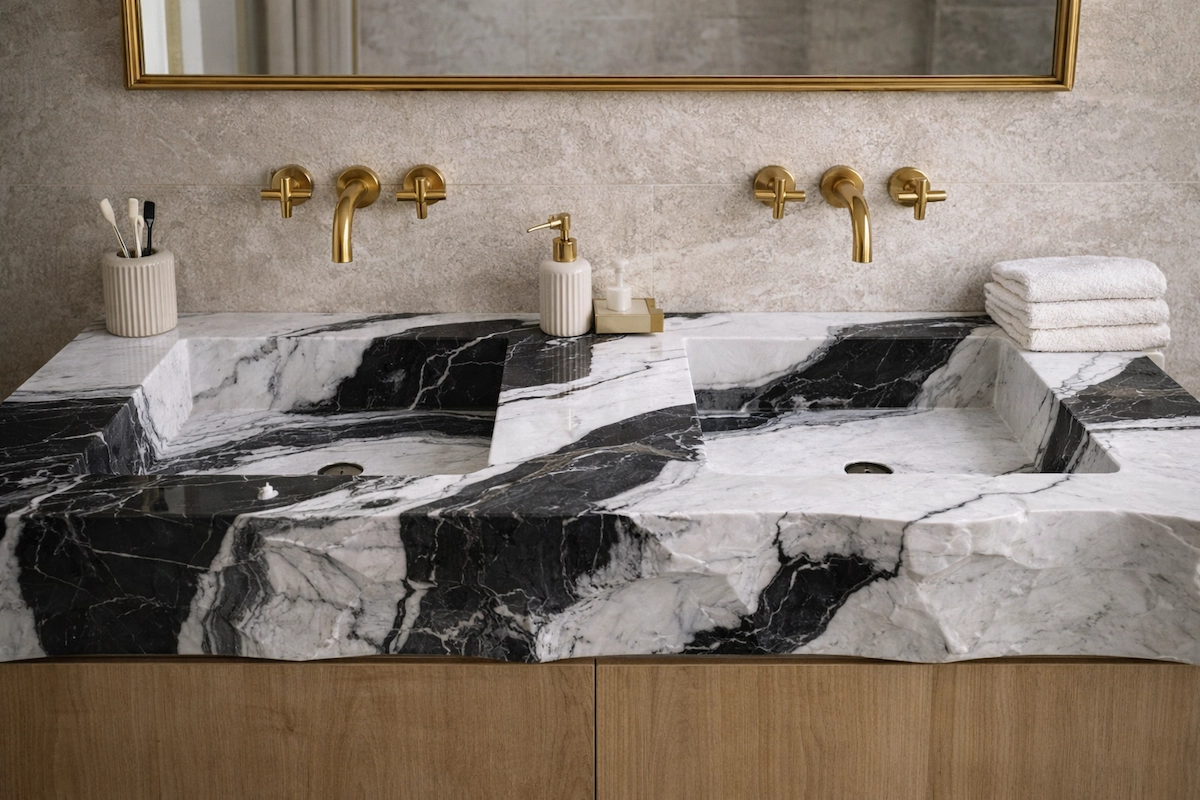 Panda White solid marble basins create a bold bathroom centerpiece that pairs well with brass, matte black hardware, warm wood, and neutral stone backgrounds.