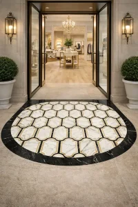 Use the lantern pattern marble floor tile to create a clean, elegant welcome zone with a classic architectural rhythm.